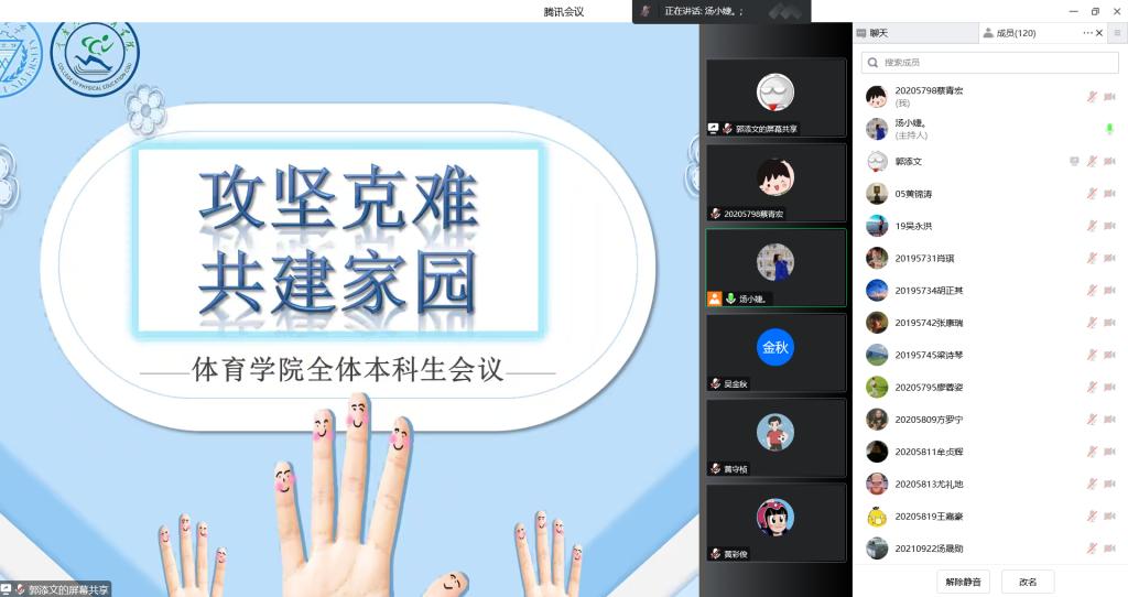 11月17日,444咖啡 2022级召开了主题为“共克时艰 抗击疫情”的主题班会,本次班会由辅导员汤婕老师主持,2022级体育教育专业全体本科生参加。本次会议采取线上会议的形式进行。首先,汤婕对竹园五栋的同学们进行了解封后的安全提醒:出行必须佩戴口罩,保持一米社交距离,勤洗手等等。并告诉同学们,一定要勤加锻炼身体,保持身体健康。汤婕对此会议进行了录制,并转发给部分在外因特殊原因未能参会的同学。同时,学院给同学们发...