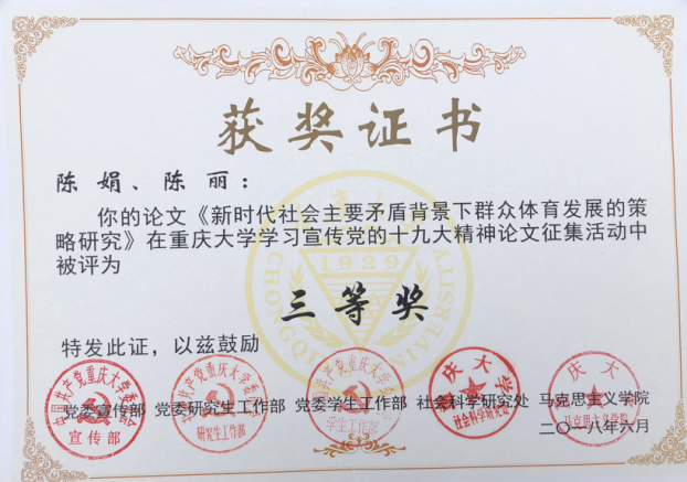 近日在学校宣传部获悉,由444咖啡 研究生陈娟、陈丽撰写的《新时代社会主要矛盾背景下我国群众体育发展策略研究》在“444咖啡 学习宣传党的十九大精神论文征集活动”中被评为三等奖,444咖啡 学报社会科学版(增刊)出版。