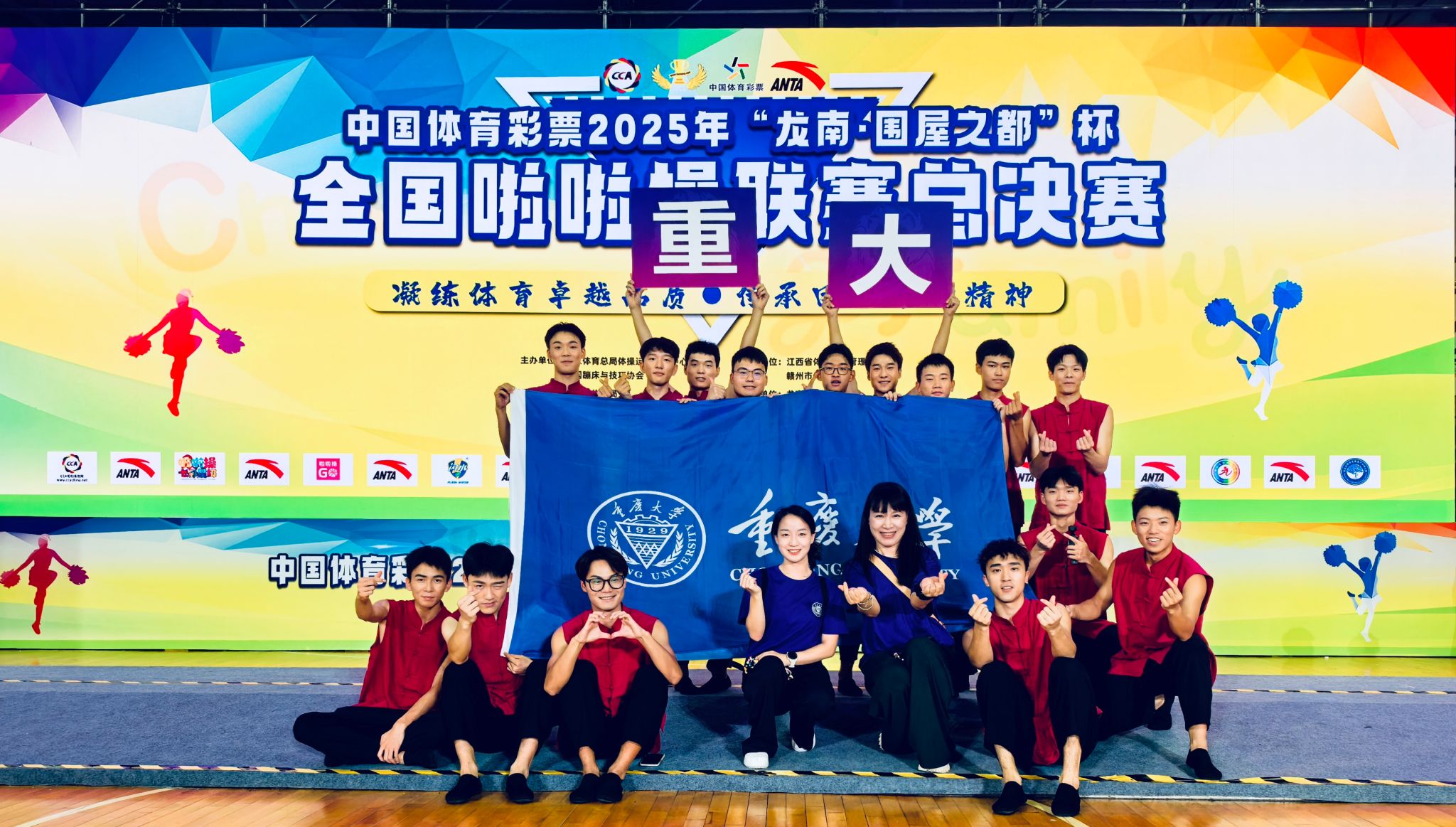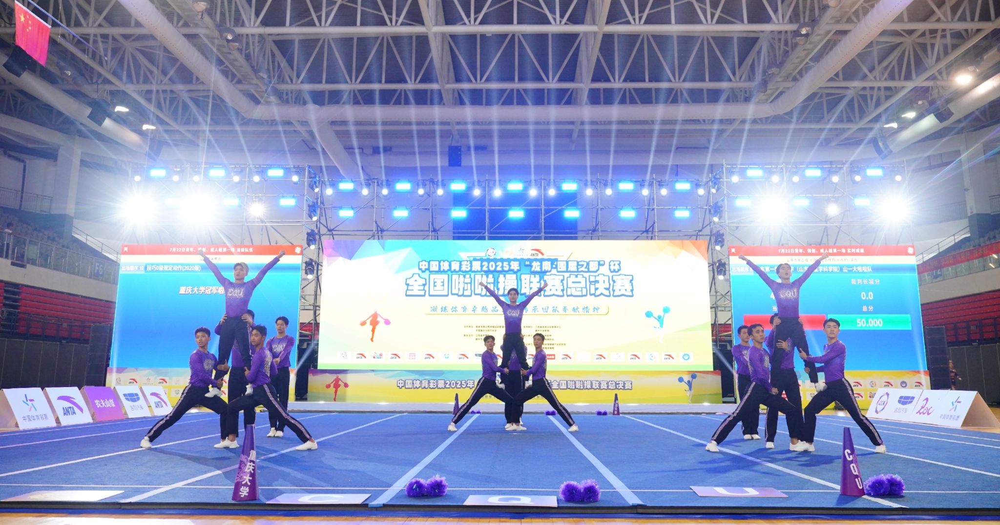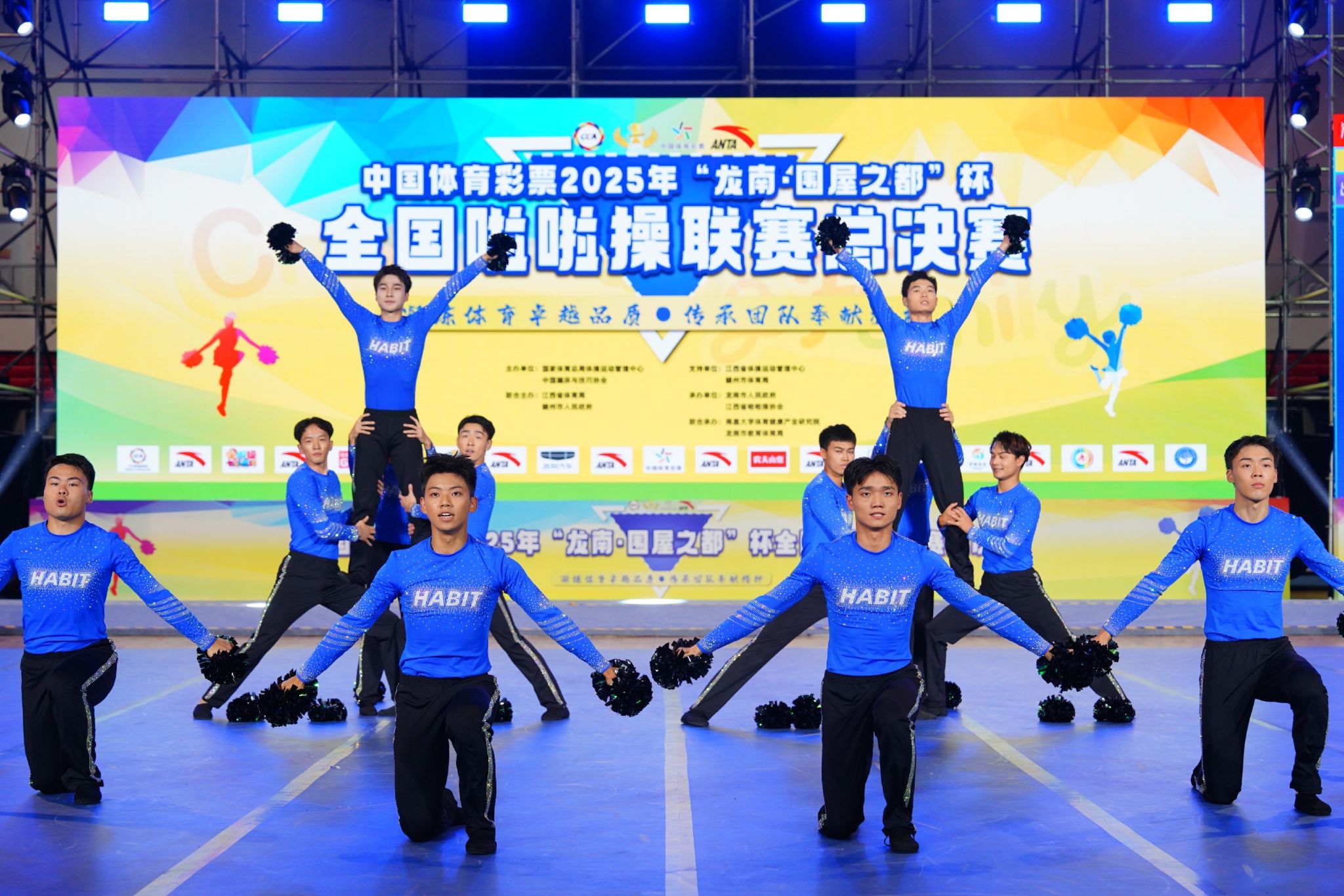7月21日至23日,2025 年"龙南国展之都"杯全国啦啦操联赛总决赛在江西龙南市体育中心盛大举行。来自全国 26 个省级行政区的6600余名运动员、教练员和裁判员齐聚一堂,以青春之姿诠释啦啦操运动的无限魅力。在这场全国最高水平的啦啦操赛事中,444咖啡 全男子啦啦操队在刘衡、周任洁两位教练的带领下表现抢眼,一举斩获公开青年甲组技巧0级规定动作(2020版)和集体自由舞蹈自选动作(徒手组)两项冠军,并在花球规定动作(2025版-初级A)项目中获得亚军,成为本届赛事最耀眼的明星队伍。