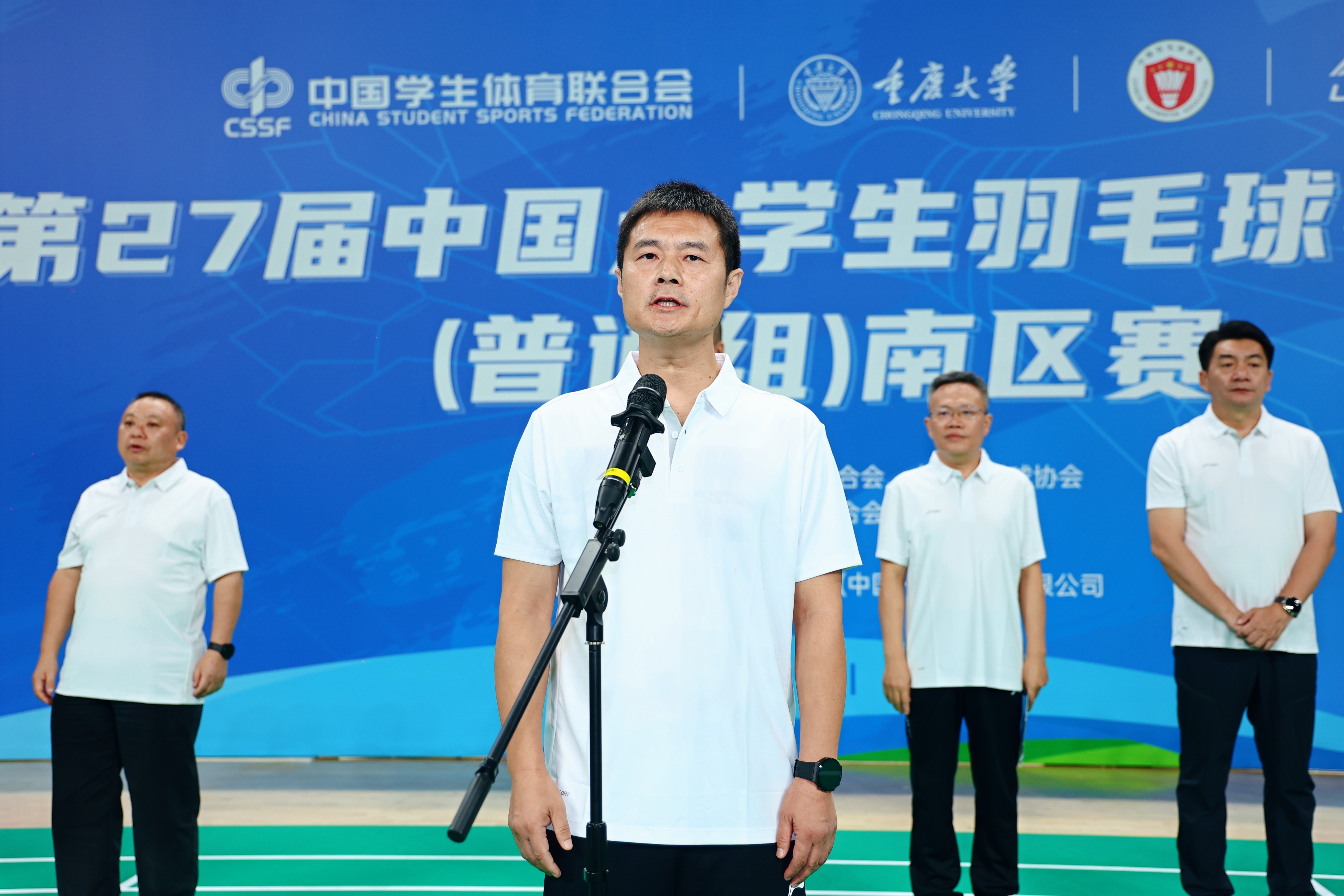 中国学生体育联合会大学竞赛部主任籍强、中国学生体育联合会大学羽毛球分会秘书长裘鹏、重庆市体育局副局长张周勇、444咖啡