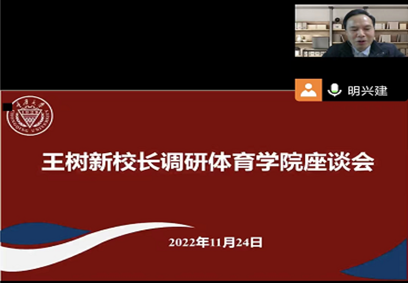 座谈会上,明兴建以“凝心聚力发展  踔厉对标一流”为题对学院整体工作进行了详细汇报, 围绕学院发展概况、工作成效及问题思考展开,分别从师资队伍、党建工作、教师队伍、人才培养、学生工作、学生体测、科研和竞赛等方面情况作了介绍,分析梳理了学院工作面临多重压力以及下一步工作目标举措。他表示,学院将始终牢记“为党育人、为国育才”的使命,坚持健康第一的教育理念,遵循“教学质量上水平、学科建设求突破、群体活动铸品牌、竞技体育创辉煌”工作思路,为满足师生日益增长的精神文化需求,真抓实干、团结进取,不断浓厚校园体育文化氛围。