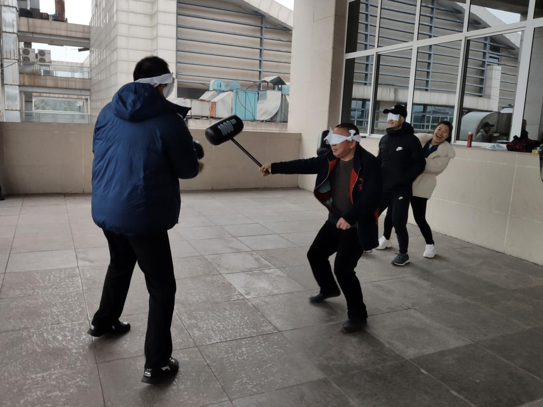 此次活动以“运动、健康、快乐”为主题,变“竞技”为“娱乐”,改“精英展现“为“全员参与”,设计了四个游戏分别为:你比我猜,气球大作战,蒙脸大比拼和答题乒乓球传球接力赛。四个游戏能让参赛者在比赛中感受运动的竞技性和趣味性,增加团队合作凝聚力。在你比我猜的游戏中,大家施展浑身解数,用各式各样的肢体语言来表达手中的词语,比赛内容也包含了很多十九届五中全会精神的词语,比如“高质量,可持续,幸福感”等,让队友在规定的时间内猜出。在此环节中,由胡红带领的一队,在三分钟以内猜中14个词语赢得第一名。