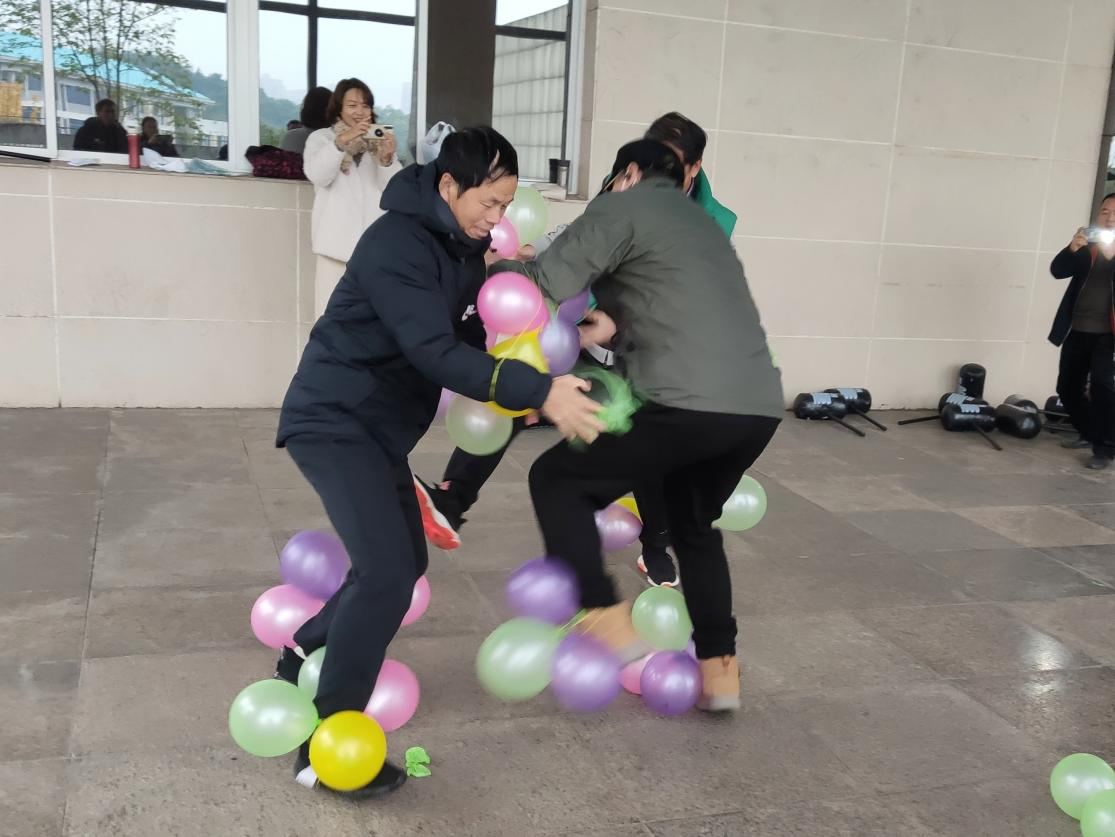 在“气球大作战”游戏中,胡红、刘磊矗和李小宁展开了激烈的比拼,每人身上绑着12个气球,他们分别代表三个小组,目的是捏爆对方身上的气球,保护自己身上的气球,到最后身上的气球保留最多,哪一个小组胜利,经过激励的比拼最终李小宁赢得了本游戏的胜利。在最后一个答题接力赛中,结合了十九届五中全会的知识,要答对相关的题目,才能进行接力赛,大家踊跃参与答题。
