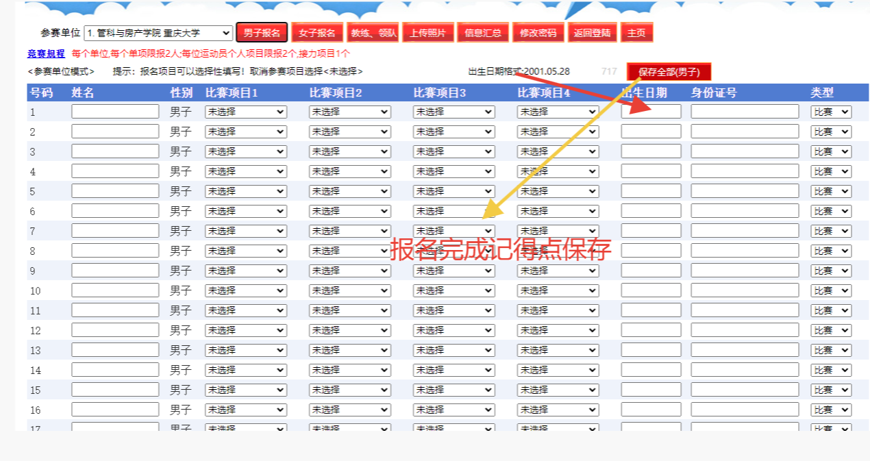 4. 报名页面(只需要填写男子报名、女子报名、领队教练,其他不填)
