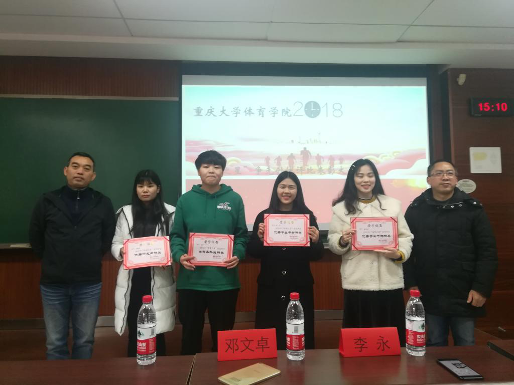 2018年 “体育之星”争先创优先进个人和先进集体的表彰决定,随后,在欢快的颁奖音乐中,李永和邓文卓分别向优秀班集体、优秀寝室和个人颁发了获奖证书。接下来是获奖代表发言,优秀学生干部标兵黄菊和优秀本科生标兵屈秦沁分别分享了她们的学习和生活经验。黄菊强调了责任感的重要性,做好学生工作就要做好老师和学生之间的桥梁,学生和学生之间的绳索;屈秦沁从六个方面分享了她的大学生活,总结出学习在我们的大学生活中很重要,但是社会实践,学生工作,公益活动以及开拓视野也很重要。
