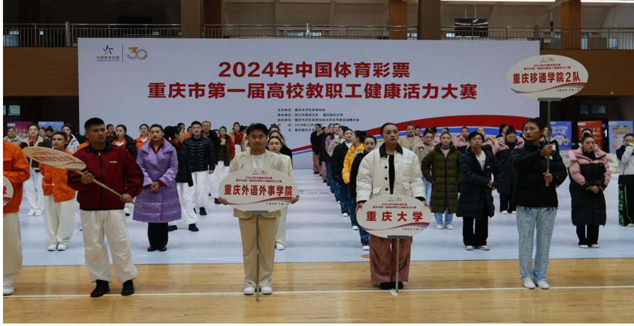 12月7日下午14时,重庆市第一届高校教职工健康活力大赛在重庆医科大学韵搏体育馆顺利举行。本次活动由重庆市学生体育协会主办,四川外国语大学、重庆医科大学承办,重庆市学生体育协会大学生操舞分会协办,重庆市学生体育协会主席胡红,重庆市学生体育协会大学生专委会副主席苟明,重庆市学生体育协会大学生专委会秘书长唐建忠,重庆医科大学体育医学院院长常青等领导嘉宾出席了大赛开幕式