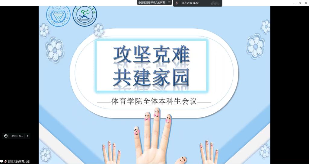 召开“攻坚克难,共建家园”线上会议。学院党委副书记李永出席,全体本科生参加。本次会议由学院团委书记、本科生辅导员汤婕主持。