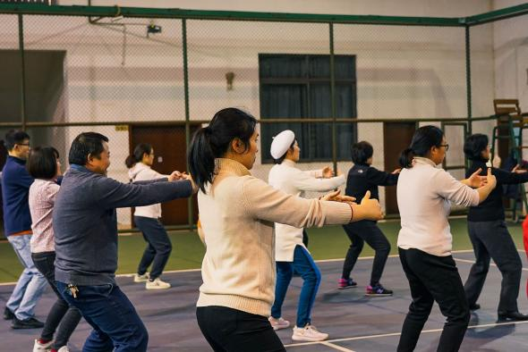 工间操是一种大众喜闻乐见的健身形式,它对促进身体健康、振奋精神面貌、强化团队协作有诸多益处,由汤婕和周任洁两位老师组织。老师们积极参与,学习掌握工间操的基本动作。