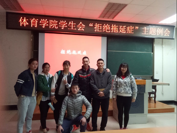 到会议最后,每个人都分享了自己克服拖延症的方法,比如说树立一个目标,在每天晚上想一下自己要做的事情,或者把要做的写在笔记本上面以免忘记,还有急躁症的同学不要急躁,及时调整自己,合理分配时间。