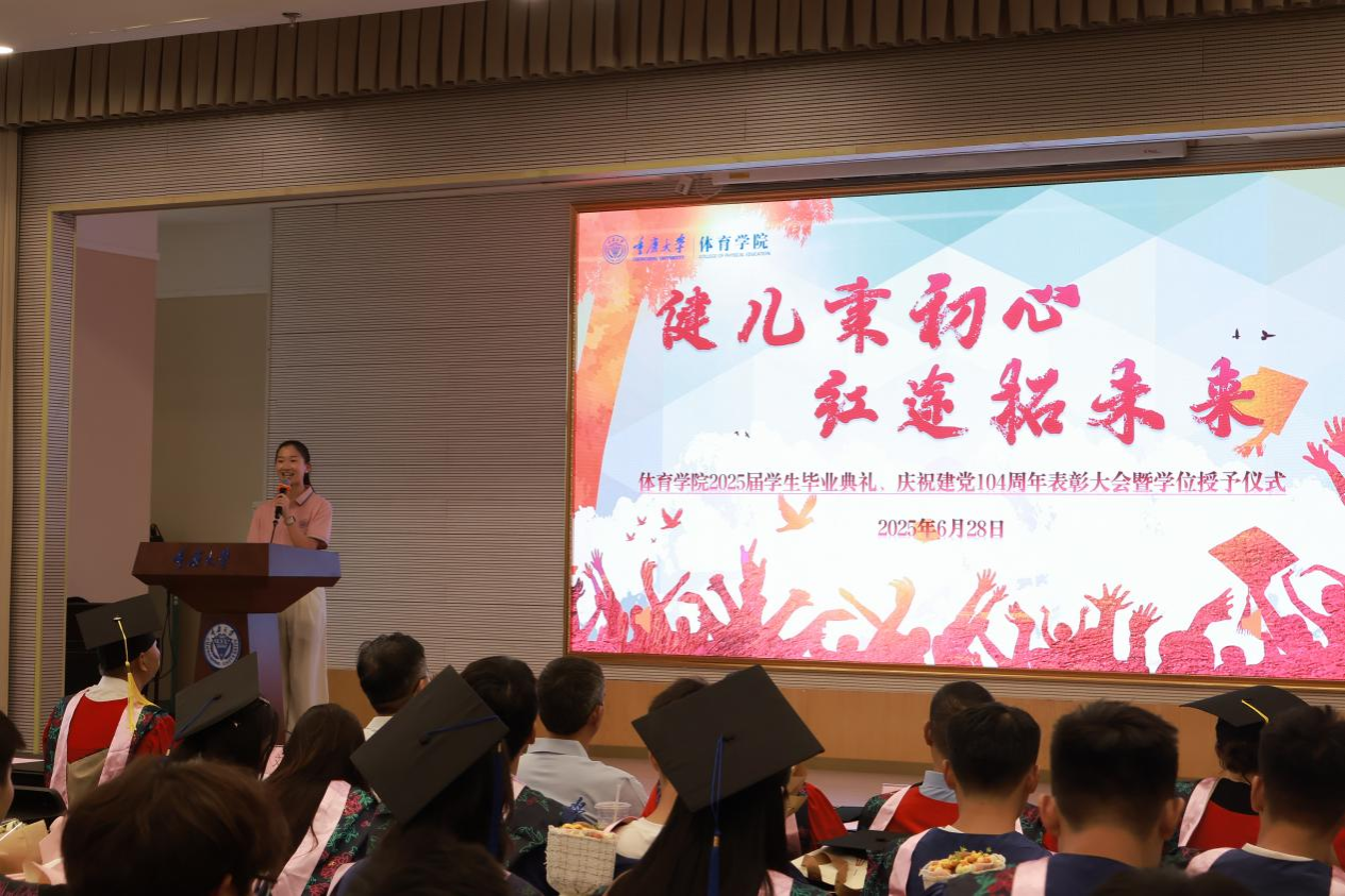 本次典礼第二项议题为庆祝建党104周年表彰大会。田辉书记以 “以建党精神铸魂,赴体育强国新程” 为主题致毕业寄语并宣读表彰决定。