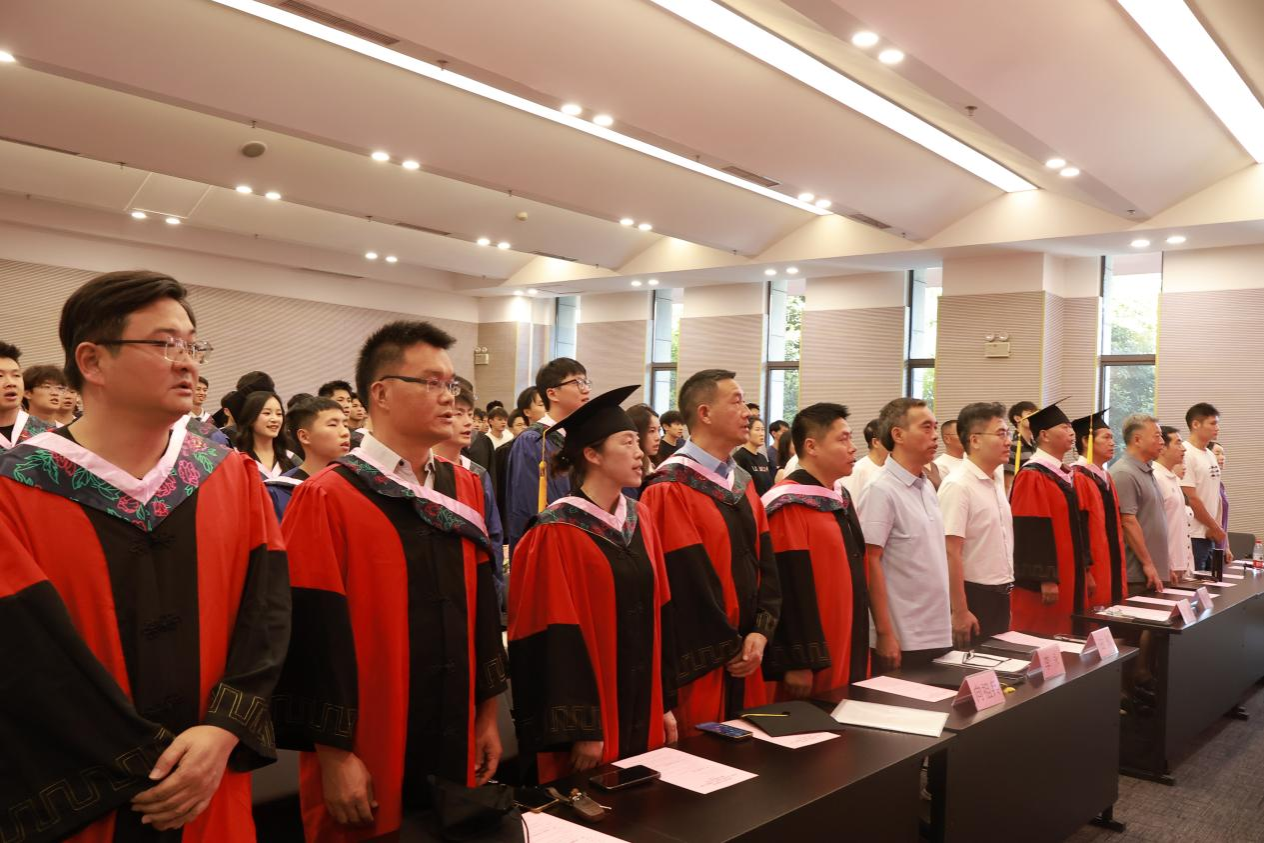 毕业典礼在雄壮的国歌声中拉开序幕。典礼现场播放了毕业生精心制作的毕业纪念视频,回顾了毕业生们在学术科研、运动训练、社会实践、大学生活的成长足迹。