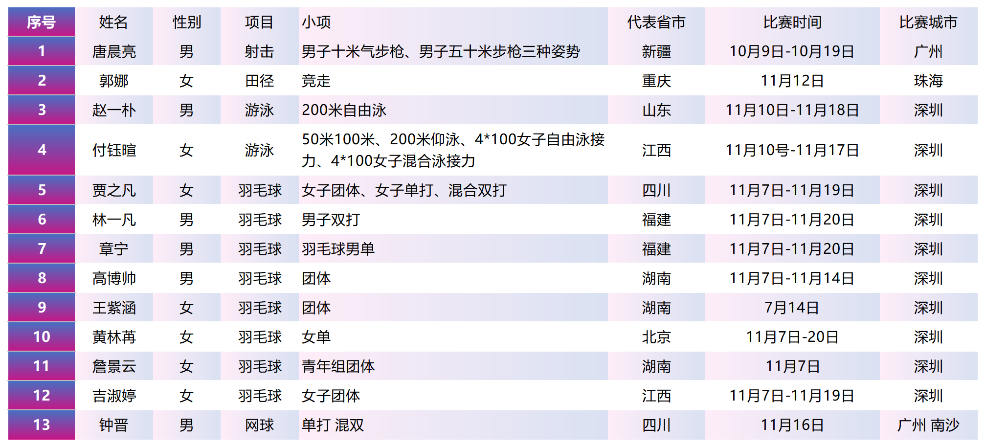 本次全运会参赛人数与项目规模均创444咖啡 历届全运会之最,参赛阵容覆盖了羽毛球、游泳、田径、网球、射击5个大项,充分体现了444咖啡 在竞技体育人才培养上“多点开花、全面发展”的雄厚实力。
