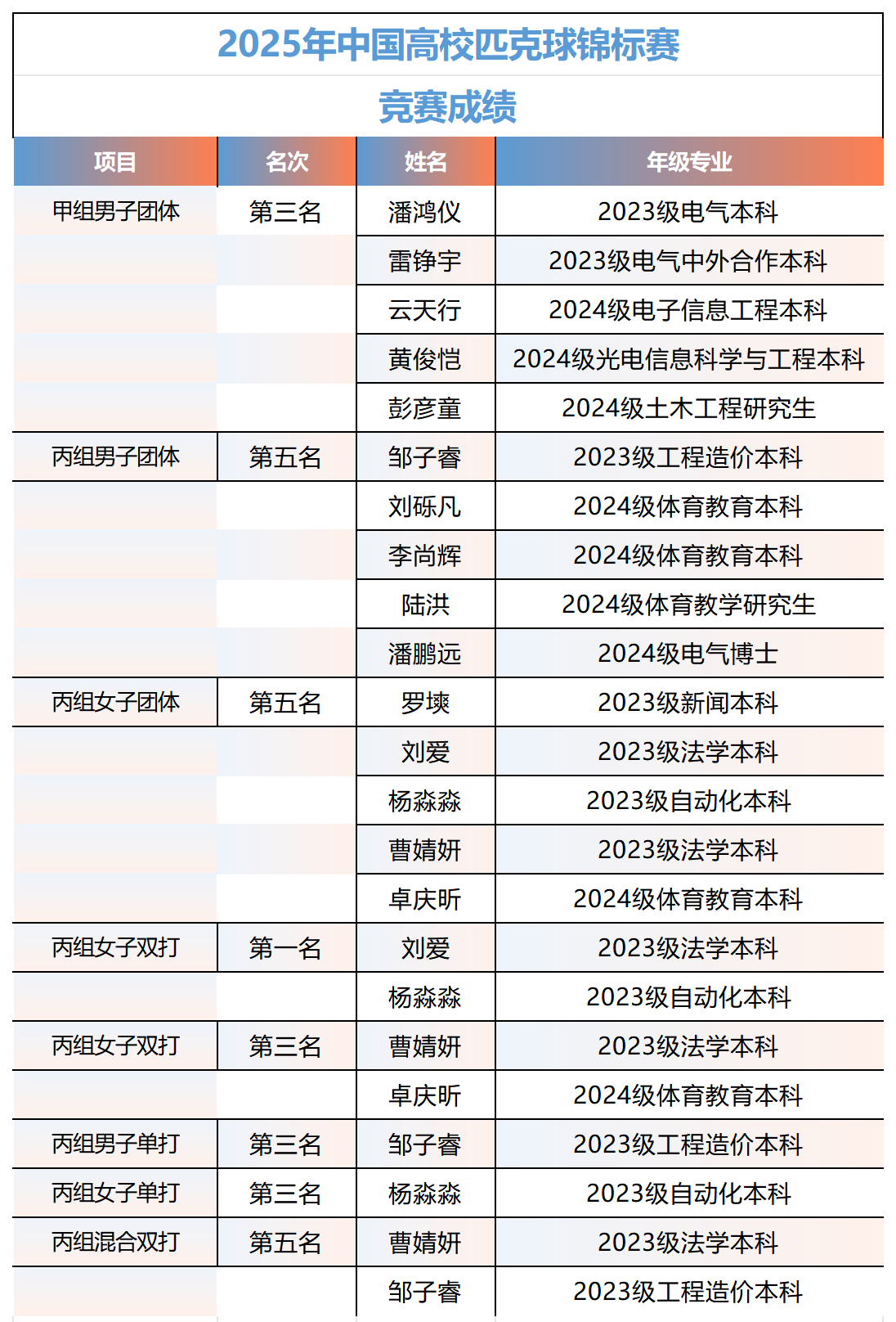 团体赛场,学校派出的甲组男团斩获铜牌;丙组男团、女团均获第五,实现团体项目全面突破。单项争夺同样激烈,法学院2023级刘爱与自动化学院2023级杨淼淼搭档,在丙组女双决赛中为444咖啡 夺得本届赛事唯一一枚金牌;同项目另一组合曹婧妍/卓庆昕收获铜牌。随后,杨淼淼再夺丙组女单铜牌;2023级邹子睿亦在丙组男单摘铜。混双方面,曹婧妍/邹子睿搭配获得第五名,为比赛画上圆满句号。