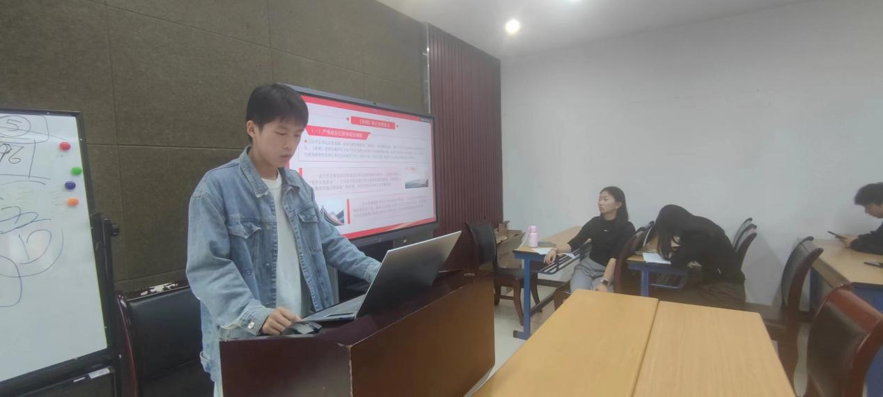 然后,由陈笑带领大家对“要坚持党性党风党纪一起抓,要坚持把纪律挺在前面,认真履行党章赋予的职责”进行专题学习,并由此引申至当代大学生怎样做好自身学习建设,同时作为党员,特别是学生党员应干什么、能干什么、应该怎么干,以勉励自身。