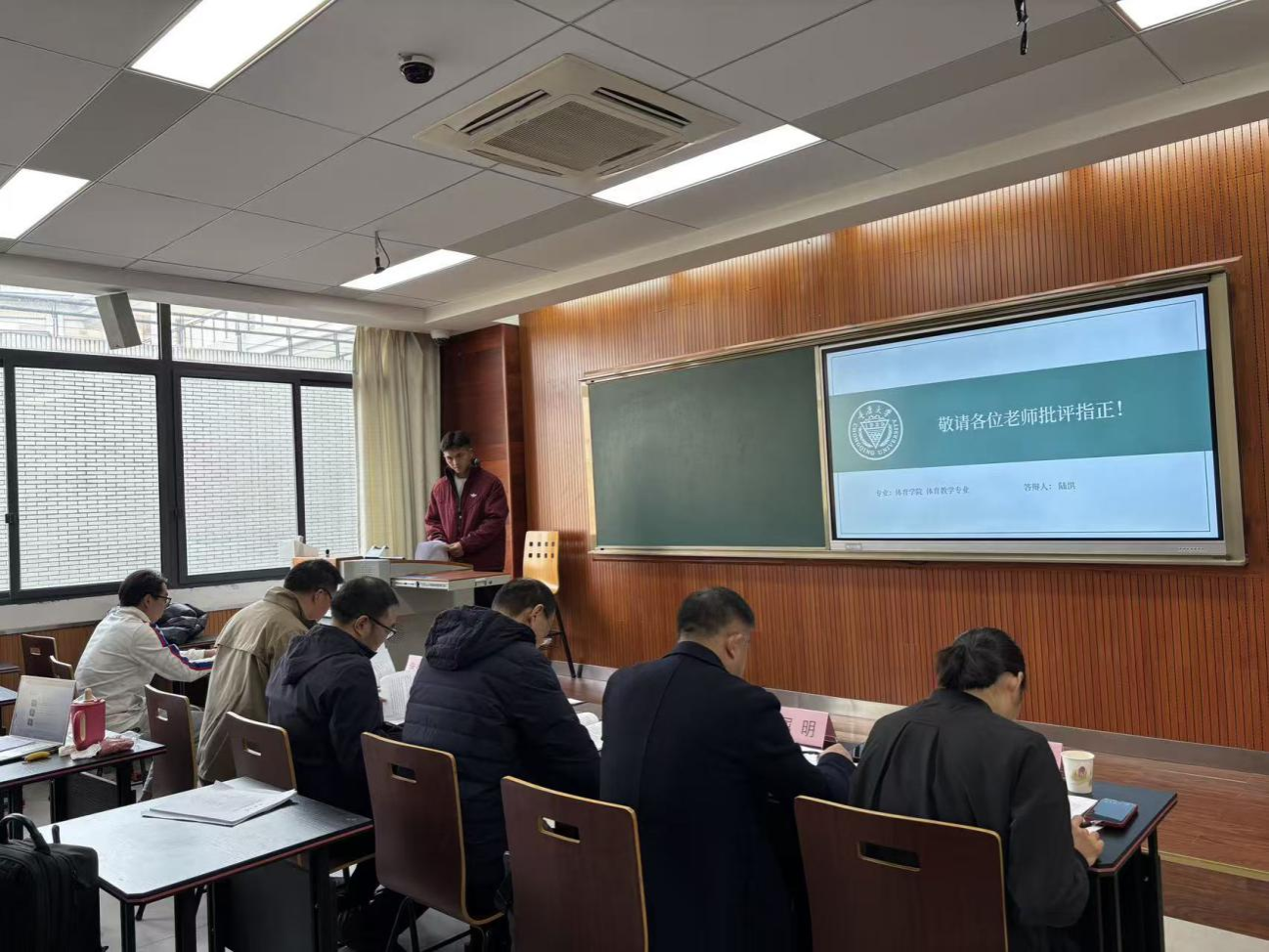 答辩现场学术氛围浓厚,秩序井然。参与答辩的研究生通过PPT围绕选题背景、研究意义、国内外研究现状、核心研究内容、研究方法、技术路线、创新点及预期成果等关键环节,阐述了各自的研究框架与思路。选题涵盖体育教育训练学、体育人文社会学、体育产业等多个领域,部分论文聚焦农村体育教师发展、优化体育课教学方法等议题。