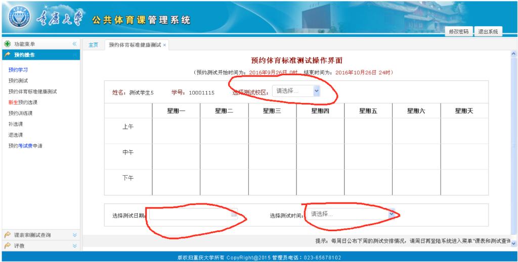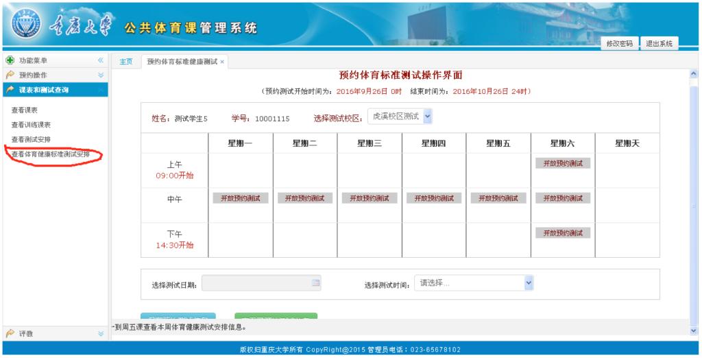 当周预约下一周的体质健康标准测试;测试时间分布在周一至周五中午及周六三个时段;由于天气或预约人数过少原因有可能预约失败,学生预约后可于当周星期天查看预约成功与否,预约不成功,下周可继续预约;